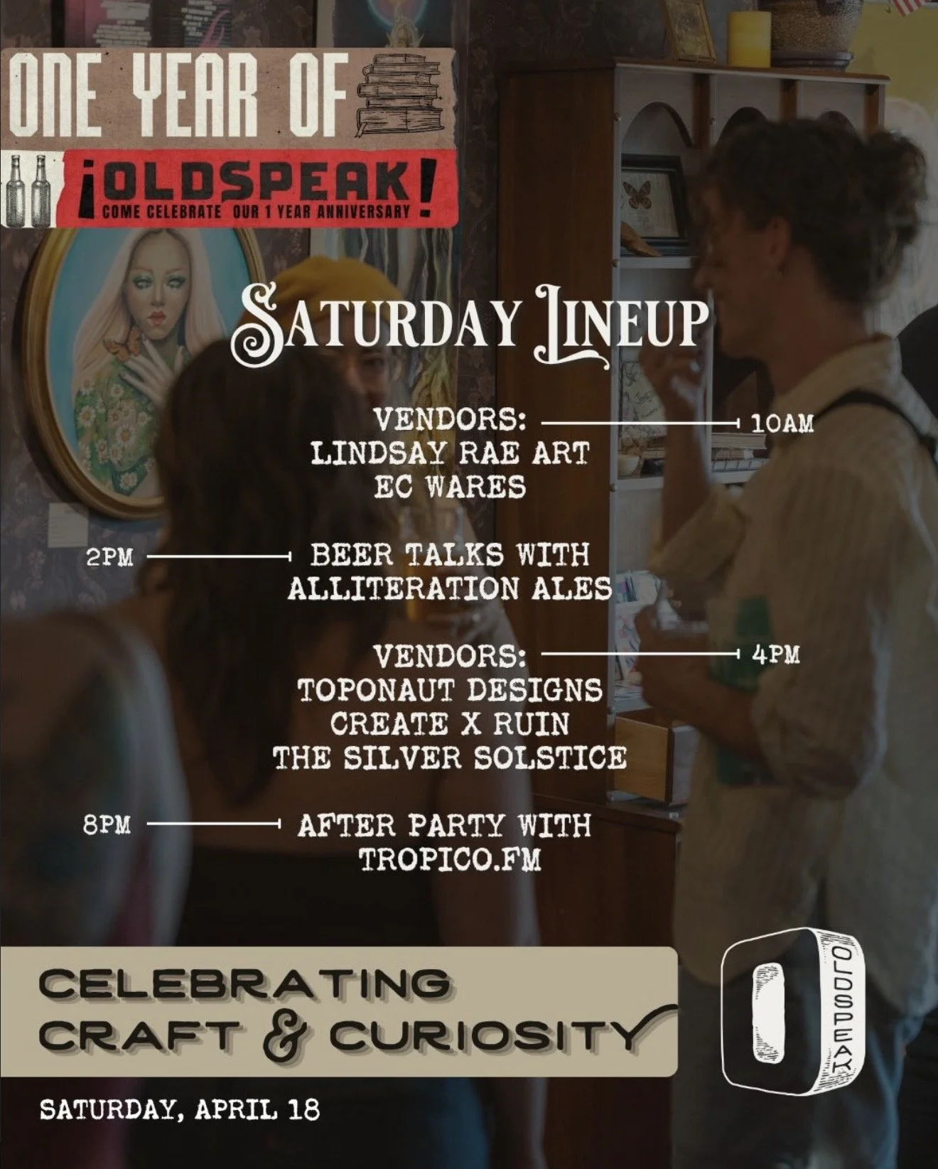 Come celebrate one year of Oldspeak! You have a whole weekend of festivities to check out. Be there Saturday for some shopping, a talk back with Alliteration Ales, and stick around to dance at the Tropico FM after party!